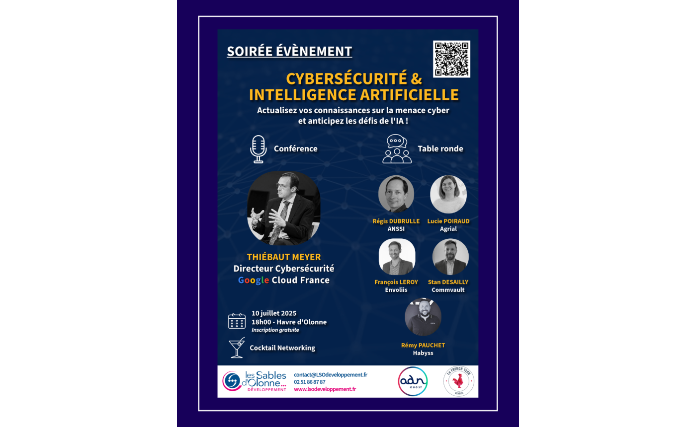 Les Sables d'Olonne Développement, ADN Ouest et la French Tech Vendée vous proposent une conférence dédiée à la cybersécurité des entreprises à l'heure de l'intelligence artificielle.