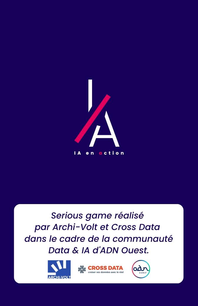 Le serious game "IA en action - Cycle d'un projet IA en entreprise" a été réalisé par Archi-Volt et Cross Data dans le cadre de la communauté Data & IA d'ADN Ouest, placé sous licence Creative Commons CC-BY-SA (Attribution - partage dans les mêmes conditions)
